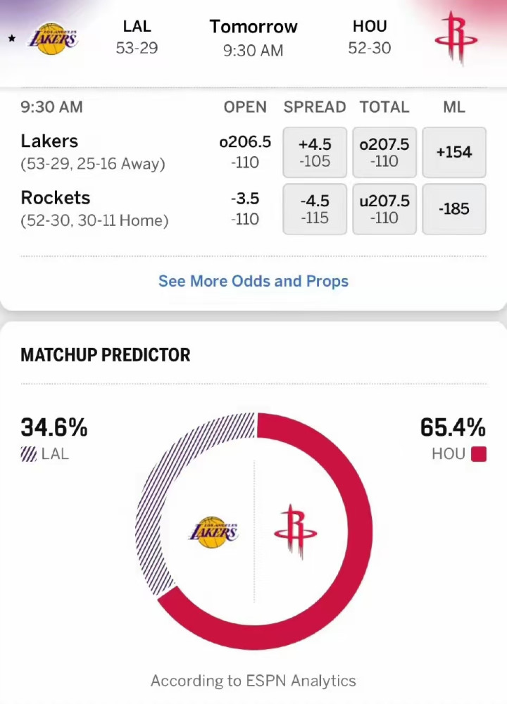 赛前ESPN对本场比赛的胜率进行了瞻望,以为客场挑战的湖东谈主队只是有34.6%的胜率,而主场作战的火火箭队高达65.4的胜率,看来ESPN还口角常看好主场作战的火箭队,这关于客场挑战的湖东谈主队来说皆备口角常坏的音讯。